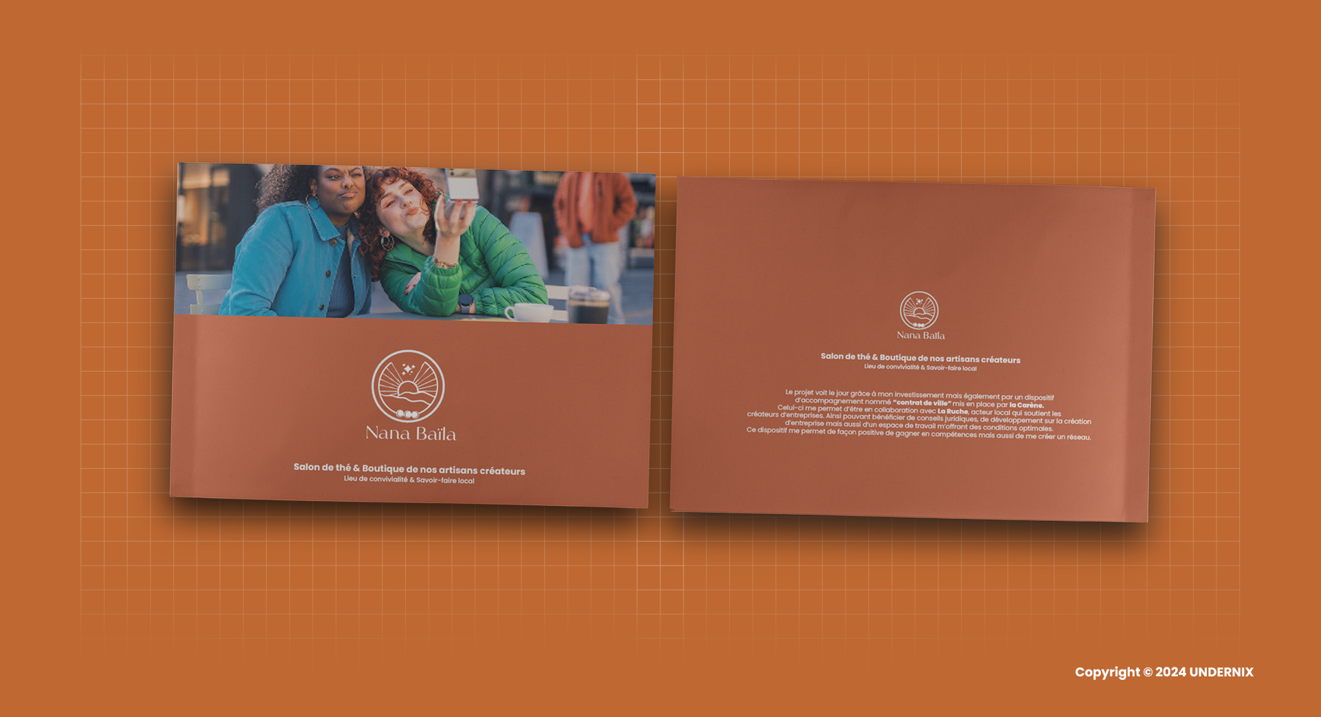 Nana Baïla , un salon de thé engagé et visionnaire, Nous a confié la réalisation d’un support imprimé destiné à présenter son projet auprès des instances et des financiers. Ce document a été conçu pour mettre en lumière l’essence même de Nana Baïla : un lieu où qualité, écoresponsabilité et diversité culturelle se rencontrent. À travers ce support, nous avons valorisé les engagements forts de Nana Baïla, notamment la proposition de produits essentiels de qualité, respectueux de l’environnement, des clients et des fournisseurs.